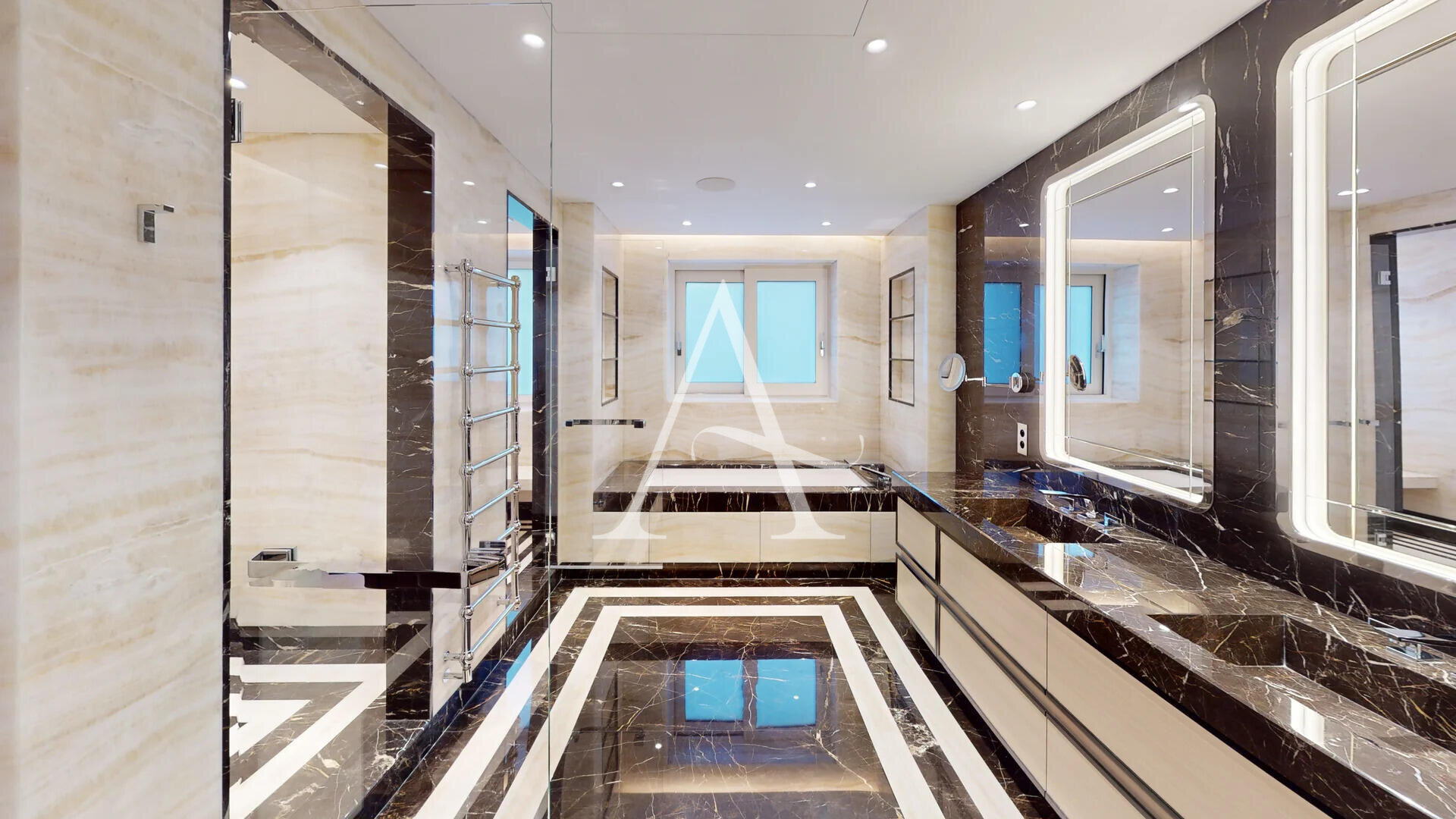 Propriété exclusive avec accès direct par ascenseur privatif arrivant sur le palier, garantissant discrétion et sécurité absolues. Appartement neuf, jamais habité, aux volumes généreux : cinq chambres, chacune avec sa salle de bains en marbre (cinq au total), réalisées avec des matériaux et finitions de très haute qualité. Espace réception complété par une véritable salle de réunion, idéal pour une clientèle internationale souhaitant allier résidence et activité professionnelle. Petit appartement indépendant avec entrée privative, relié à la cuisine, parfait pour le personnel tout en préservant l’intimité des propriétaires. La résidence Bayhouse propose spa, salle de sport équipée et business center réservés aux résidents.
